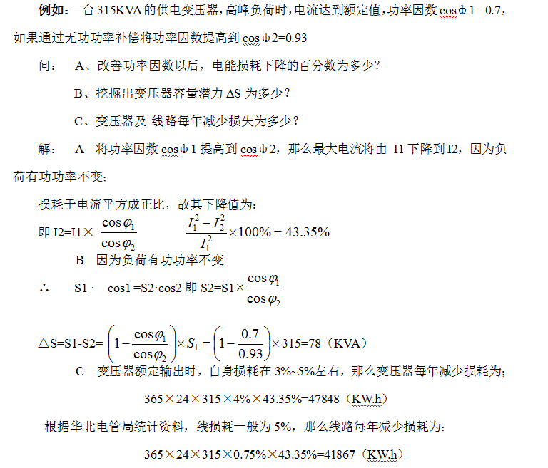 Wenn die Kapazität in Transformatoren und Leitungen unzureichend ist, kann die Methode der Installation von Reaktivleistungskompensationsgeräten verwendet werden. Die Installation von Reaktivleistungskompensationsgeräten kann die Reaktivleistung lokal ausgleichen, den Strom durch Leitungen und Transformatoren reduzieren, die Alterung der Draht - und Transformatorisolierung verlangsamen und ihre Lebensdauer verlängern. Gleichzeitig kann es die Kapazität von Transformatoren und Leitungen freisetzen und deren Tragfähigkeit erhöhen. Beispielsweise kann bei einem 100 KVA-Transformator, der derzeit bei einer Belastung von 85% mit einem COSΦ von 0,7 betrieben wird, die Installation von Reaktivleistungskompensationsgeräten die Belastungskapazität des Transformators um 30% erhöhen. Anwender können ihre Belastung erhöhen, ohne die Kapazität zu erweitern, um eine weitere Produktion zu erleichtern.