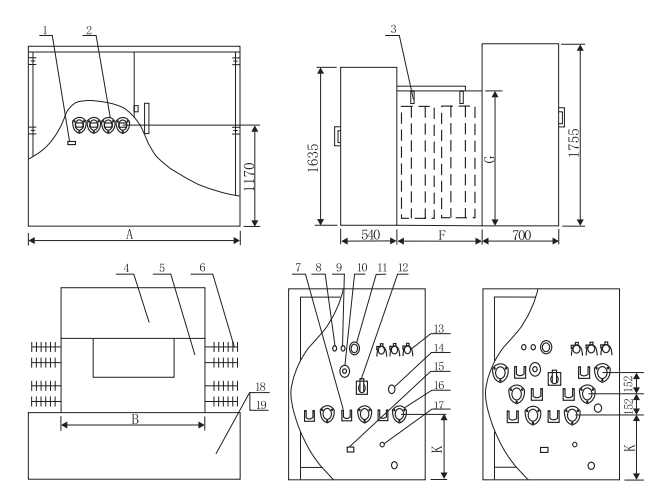 1 undrdung der Niederdruckkammer 2 Niederdruck-Gehäuse 3 Hooks 4 Hyperbarische kammer 5 kraftstofftanks 6 Heat sink 7 Wall Montage 8 Öleinjektionsport 9 Druckreliefventil 10 Öllevel Gauge | 11 Druckmesser 12 Load switch 13 Plug-in - sicherungen 14 Tap-Changer 15 undrdung in der Hypervoltkammer 16 Hochspannungs-Gehäuse socket 17 spare Nüsse 18 undrdung der Niederdruckkammer 19 Nameplatten |